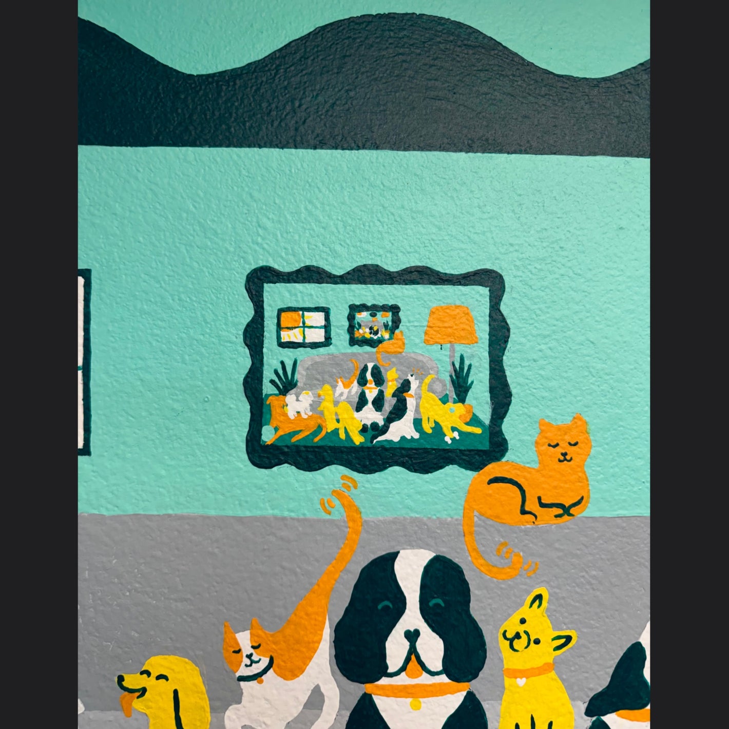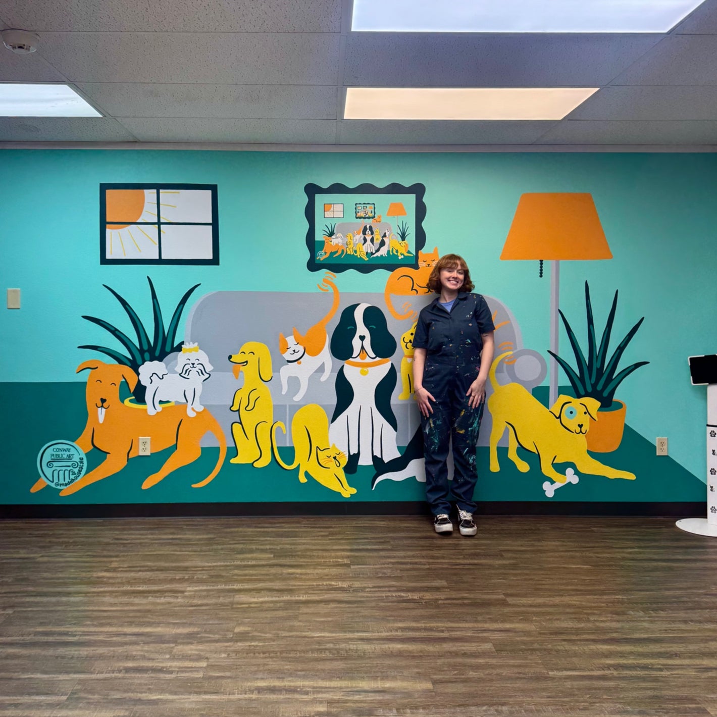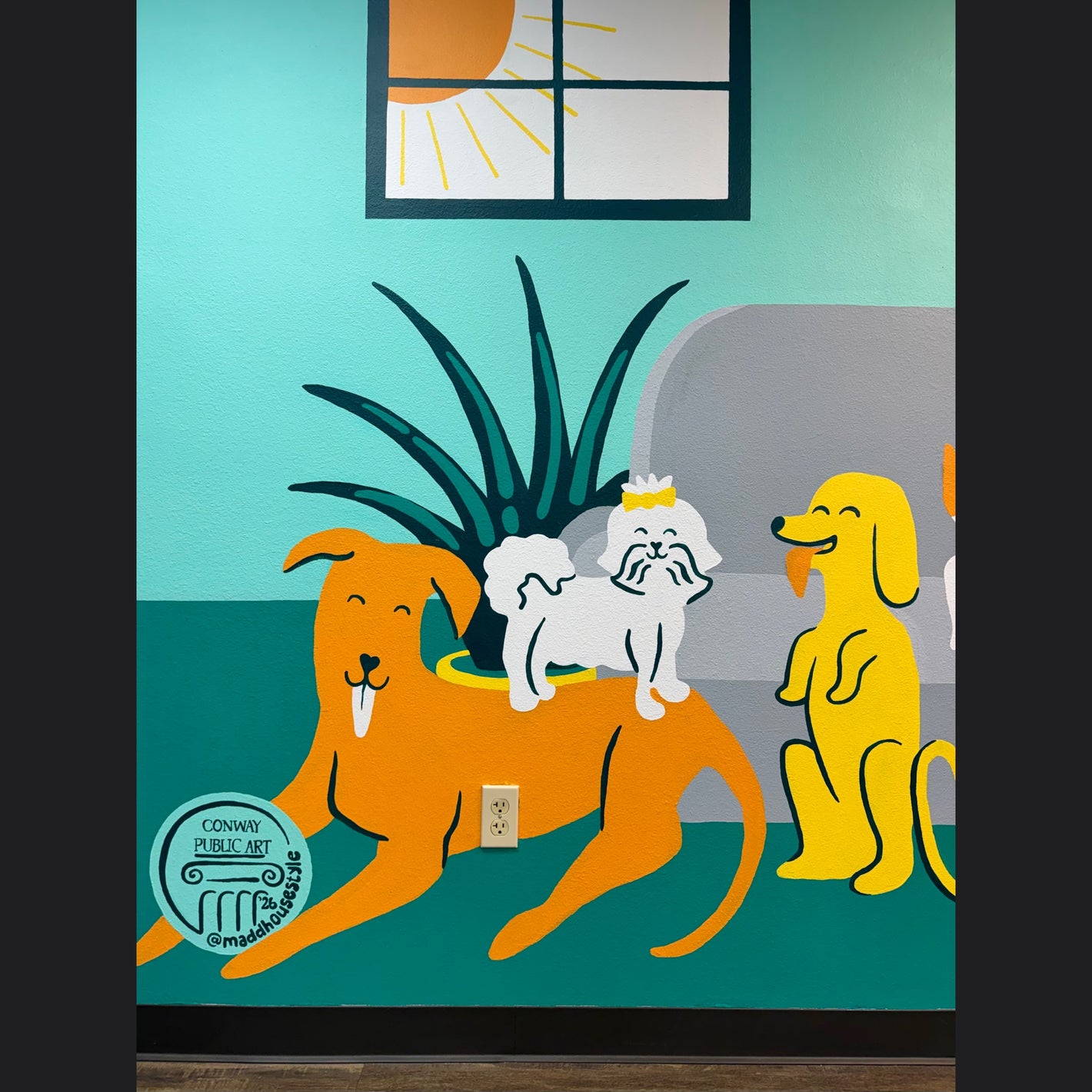 This playful pet portrait mural brings the joyful feeling of adoption to the forefront. It’s full of heartwarming furry smiles posing for the camera in a cozy, loving home. There are dogs and cats of all shapes, sizes, and colors. Their portrait is also framed behind them and repeats into itself 4 times! The @maddhousestyle handle and Conway Public Arts Council logo are all subtly acknowledged on the ball in the lower left.