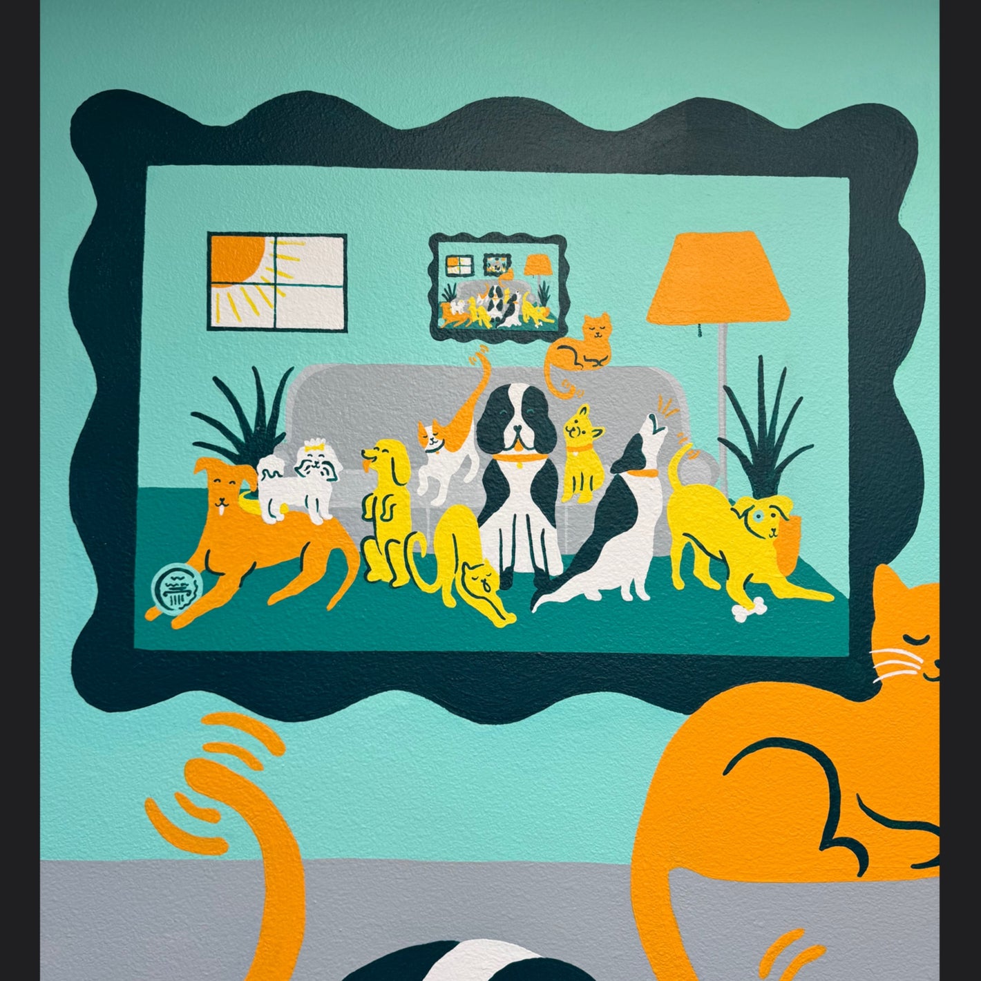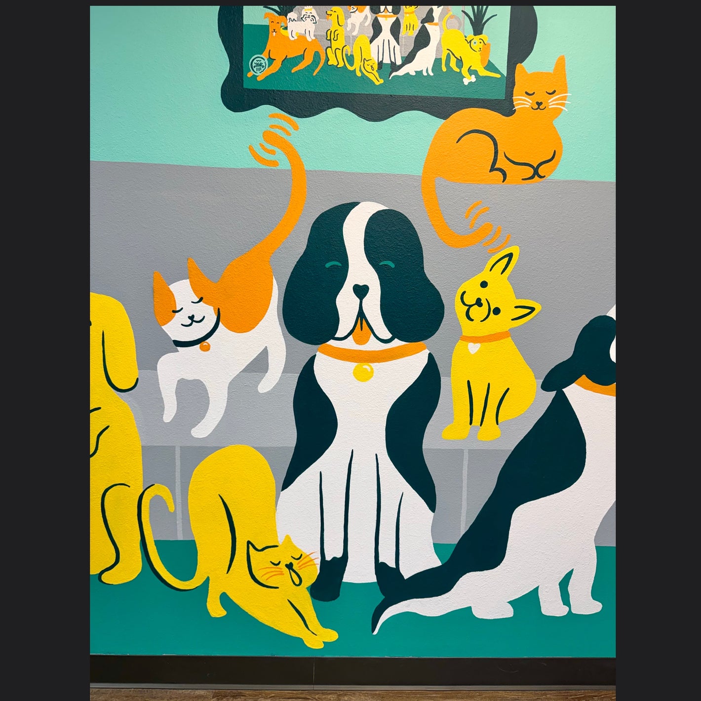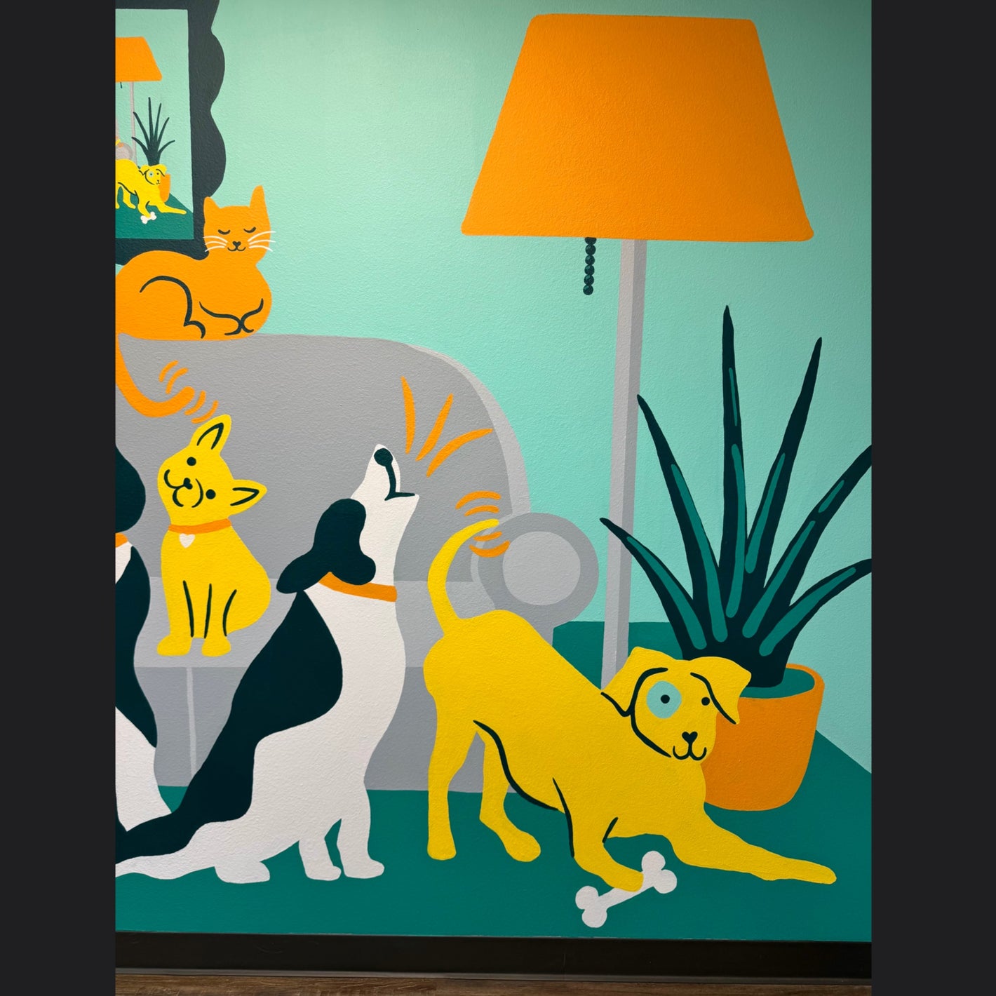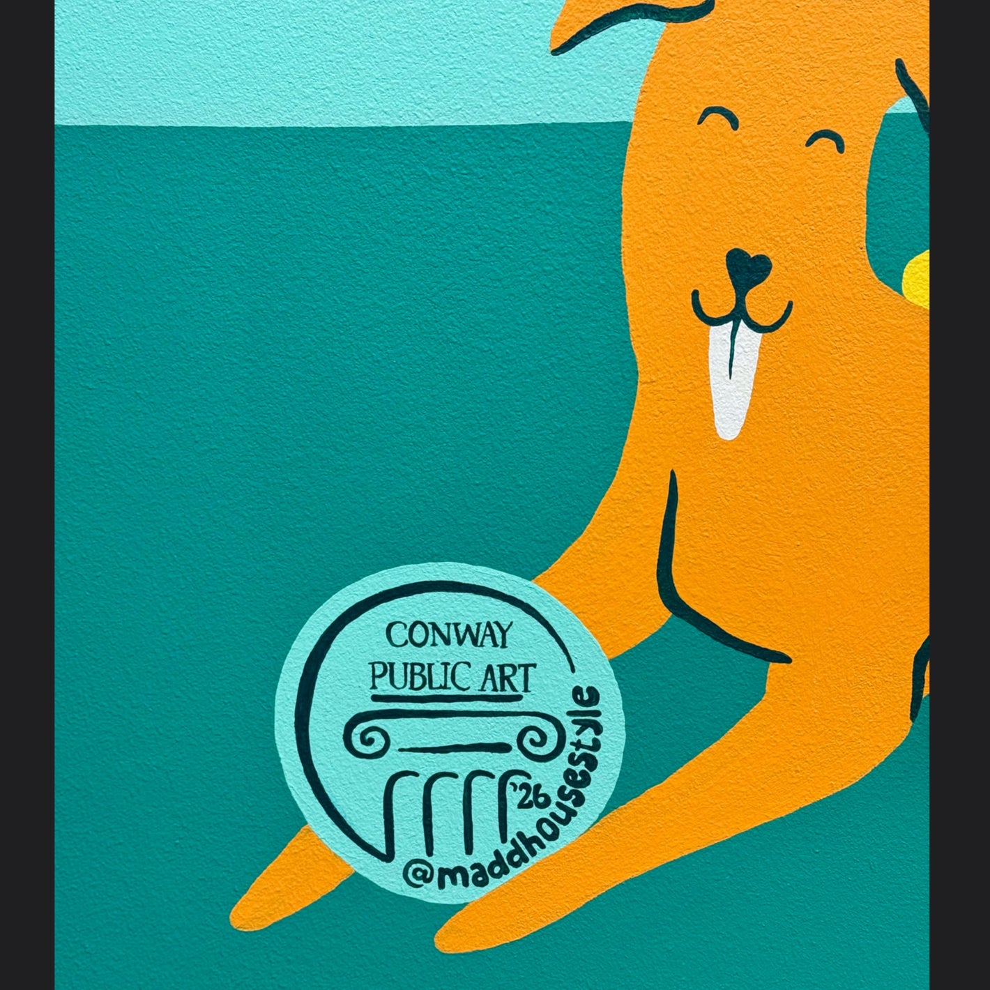 This playful pet portrait mural brings the joyful feeling of adoption to the forefront. It’s full of heartwarming furry smiles posing for the camera in a cozy, loving home. There are dogs and cats of all shapes, sizes, and colors. Their portrait is also framed behind them and repeats into itself 4 times! The @maddhousestyle handle and Conway Public Arts Council logo are all subtly acknowledged on the ball in the lower left.