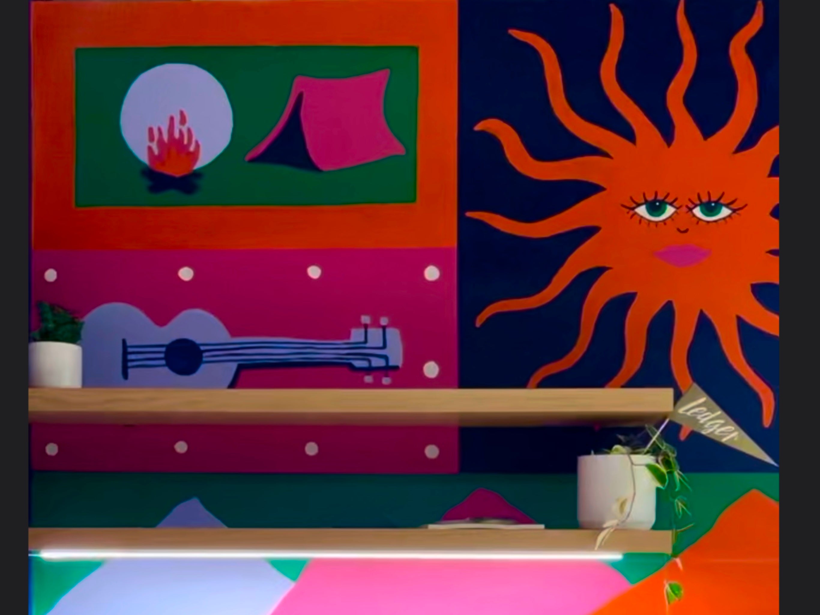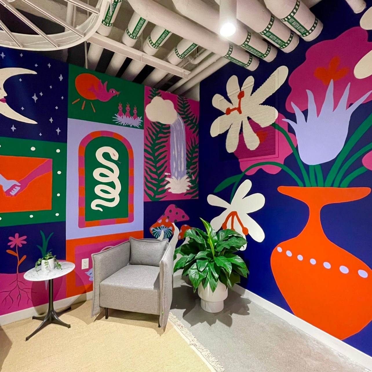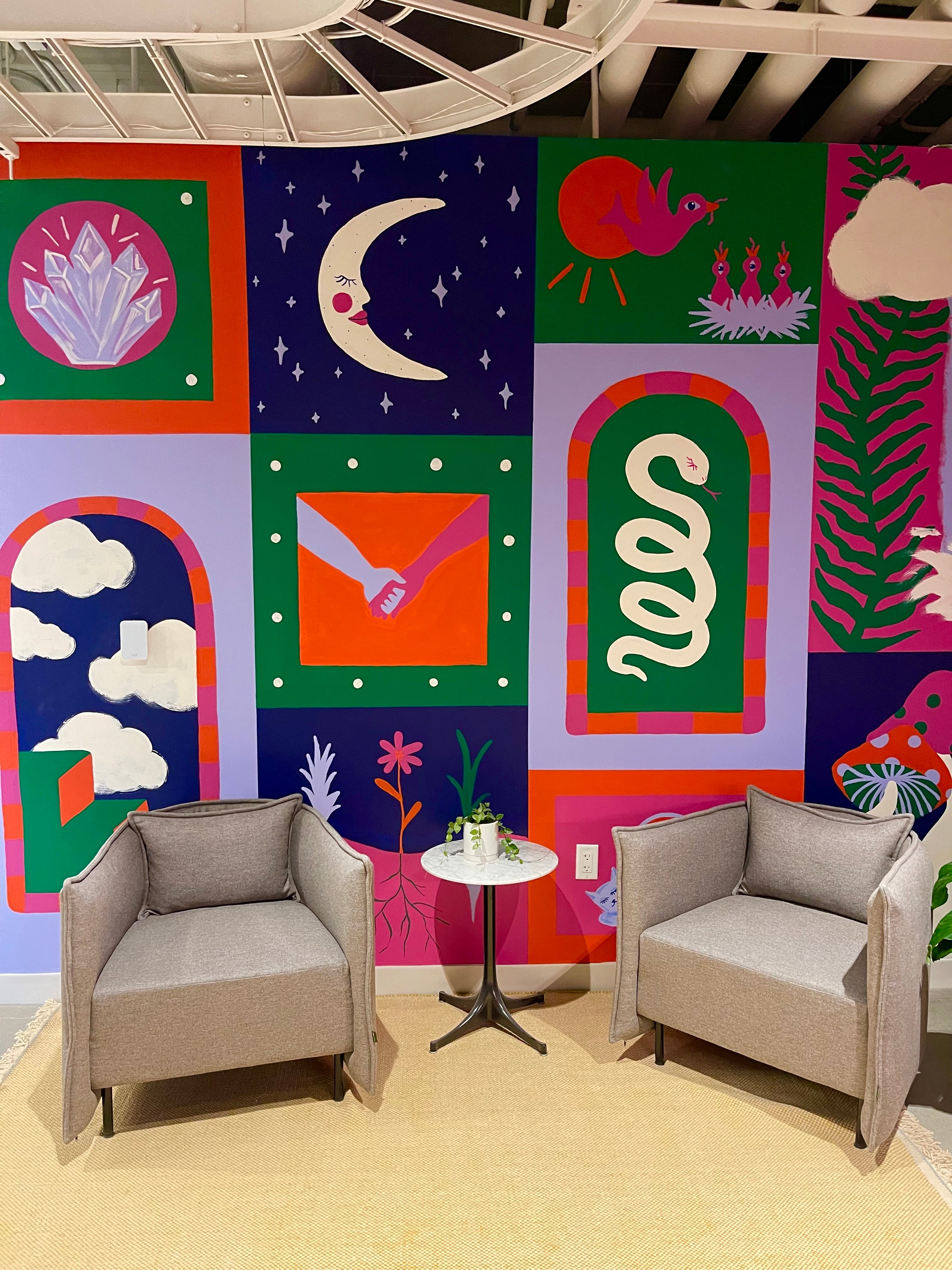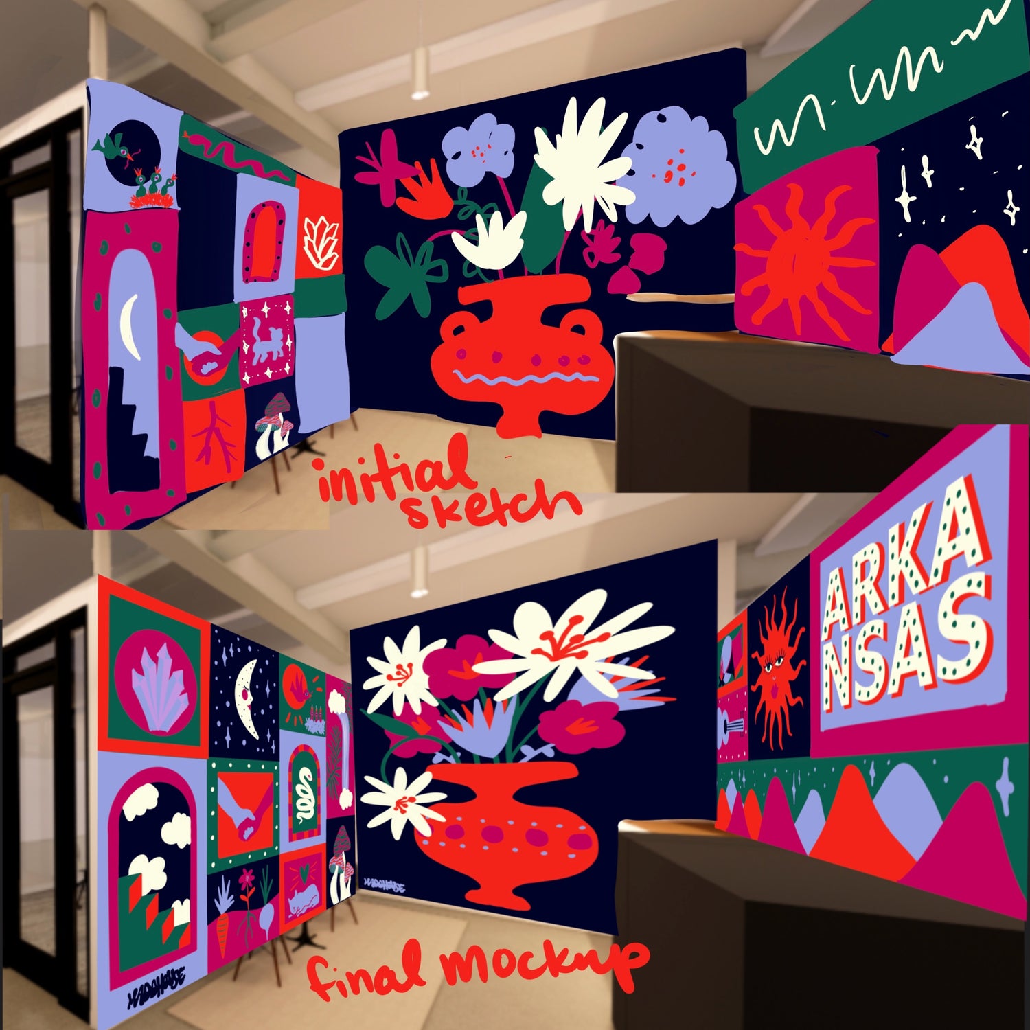 I always mockup my murals in Procreate- an illustration program for iPads. I usually mock them up flat then render them onto the wall. This example is a first sketch and final mockup. Usually there’s a couple renderings/edits between the first and last.