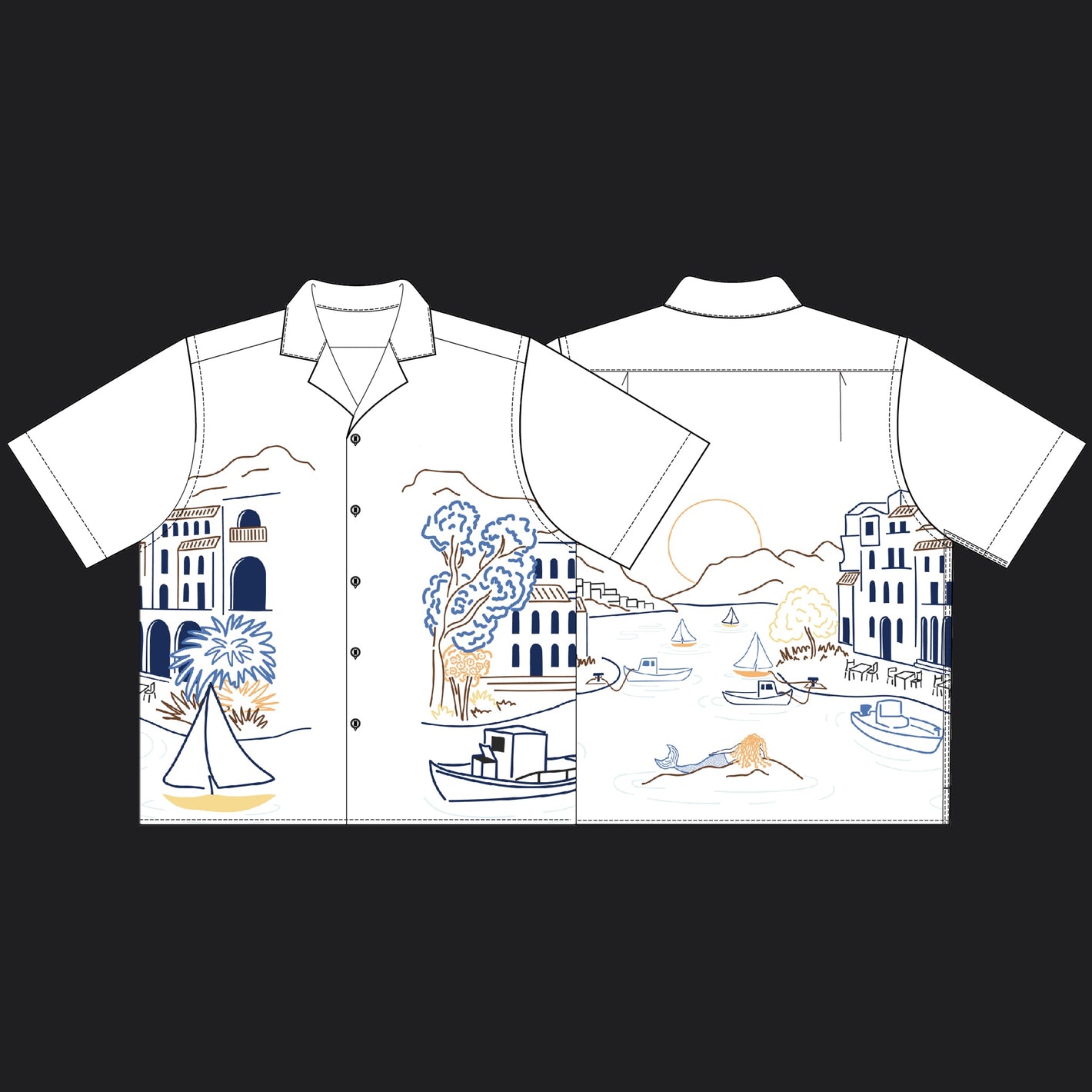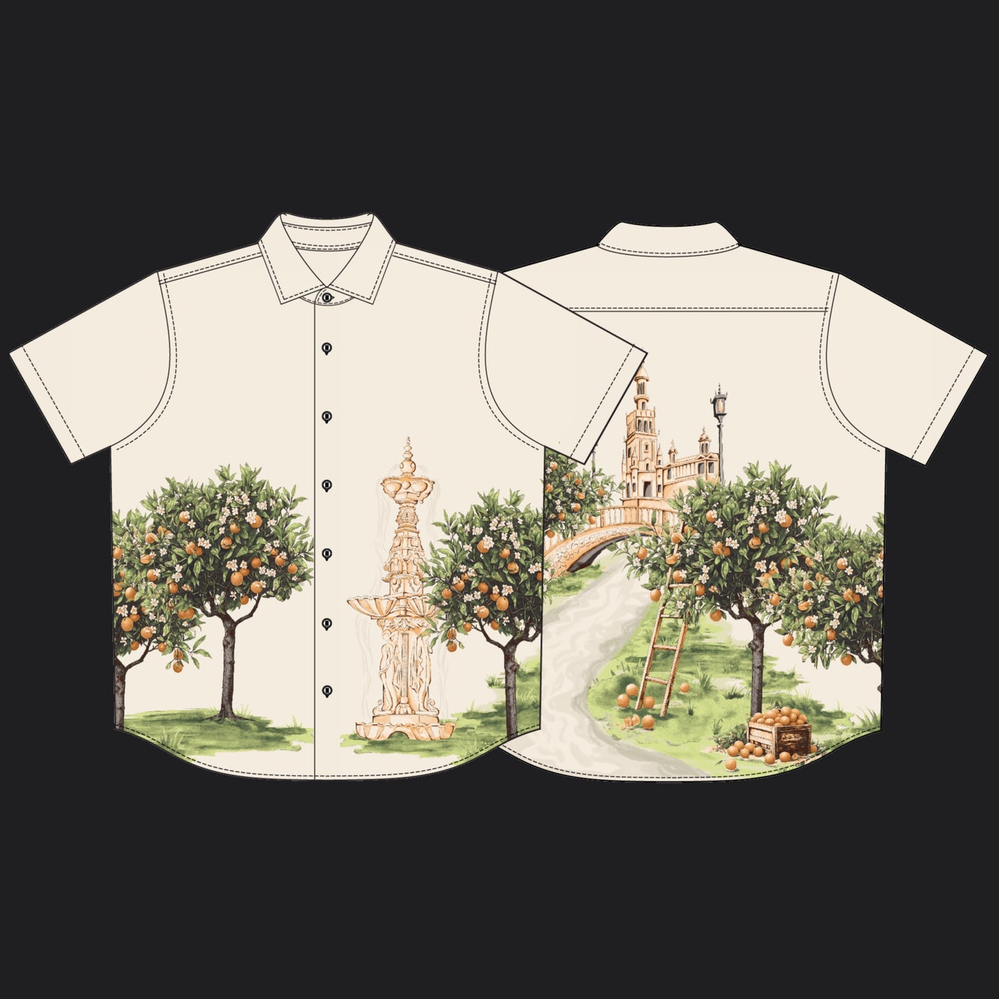 The Cityscape Button Ups are the ‘Top Door’ contemporary pieces for Murano’s Spring city collections. These designs are inspired by researching the unique culture of each city. These cityscapes are based off Seville, Spain and the Saronic Islands of Greece.